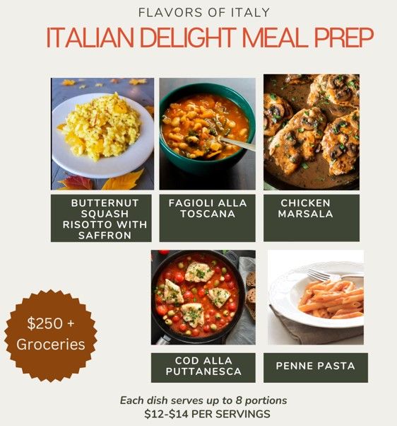 Enjoy a variety of 5 freshly prepared meals for a family of 4 which includes protein, carb & veggies. Choose your dishes and adjust servings as needed. Pricing varies with portion size. Groceries not included—Chef can shop for you at actual cost + service charge (receipts provided). See sample menus within Chef profile for dish options.